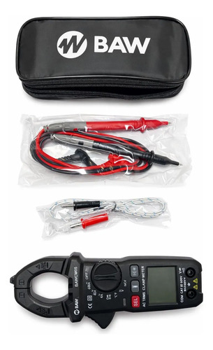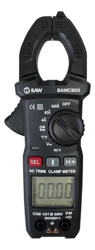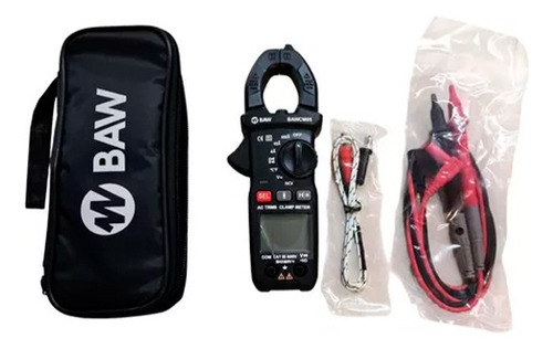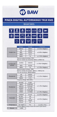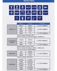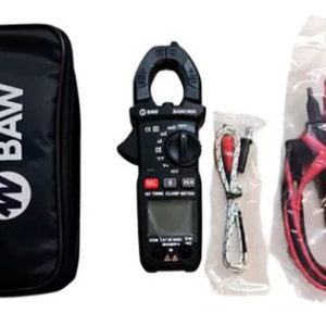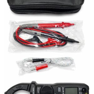 Pinza de medición digital True RMS. Medición de Corriente, Tensión, Resistencia, Continuidad y Temperatura. NCV Detector de tensión s/contacto. Display 3¾ dígitos 3999 cuentas. Rangos máximos hasta 600A y 600V. AUTO RANGO. Retención de lectura. Medición de Continuidad con alarma sonora. Prueba de diodo. Pantalla retroiluminada. Indicación de batería baja. Auto apagado. Apertura de mordaza Ø 26mm. Batería 2×1,5V AAA. Peso 208g. Dimensiones 185x71x35mm. Normativa de seguridad: EN61010-1,EN61010-4-034, CAT II 600V. Accesorios: Manual, Puntas de prueba, Termocupla Tipo “K”, Funda.